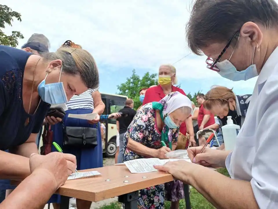 Від ранку тут зібралося близько двох десятків людей, які бажають отримати щеплення, і містяни продовжують підходити. Жителька Завадівки пані Тетяна, яка вирішила вакцинуватися в мобільному пункті, поділилася враженнями: