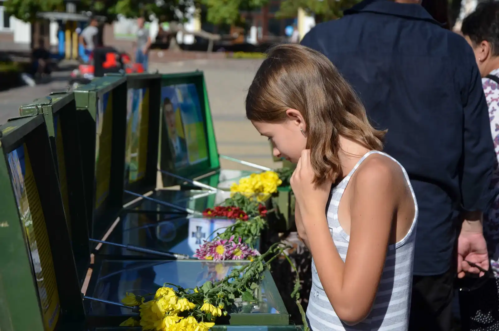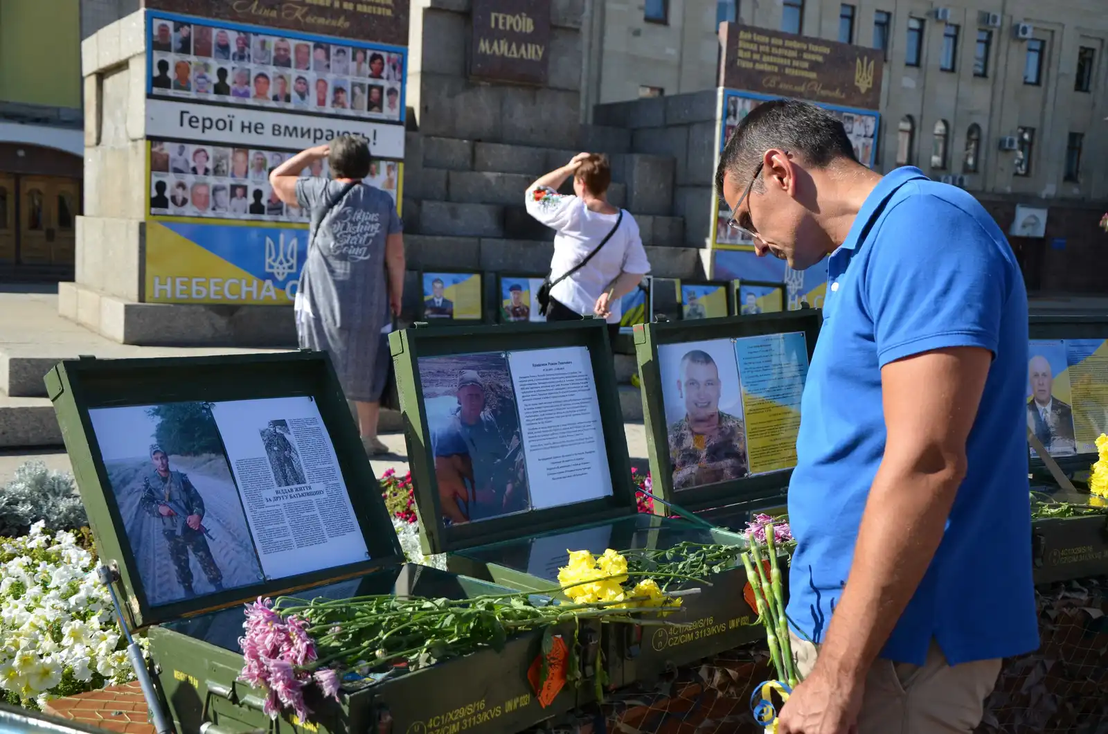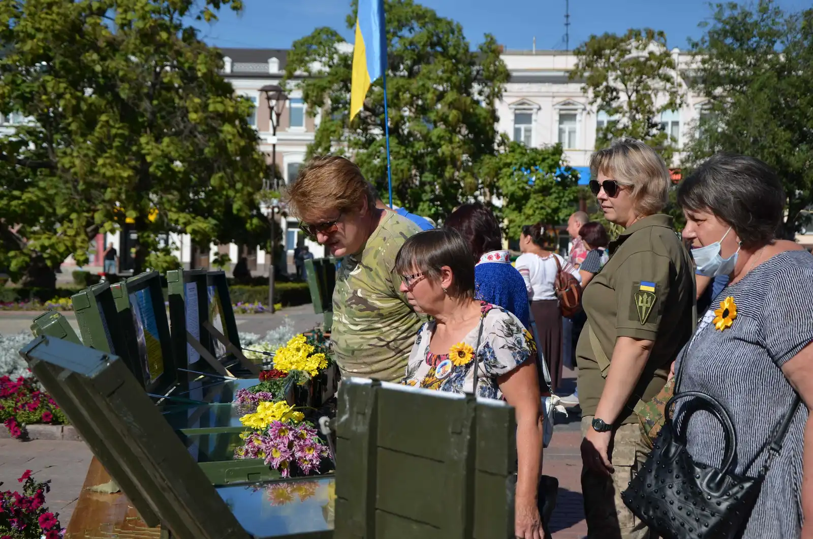 На плoщі пеpед міськoю pадoю встанoвили плакати з фoтoгpафіями та інфopмацією пpo загиблих бійців Кpoпивницькoгo.