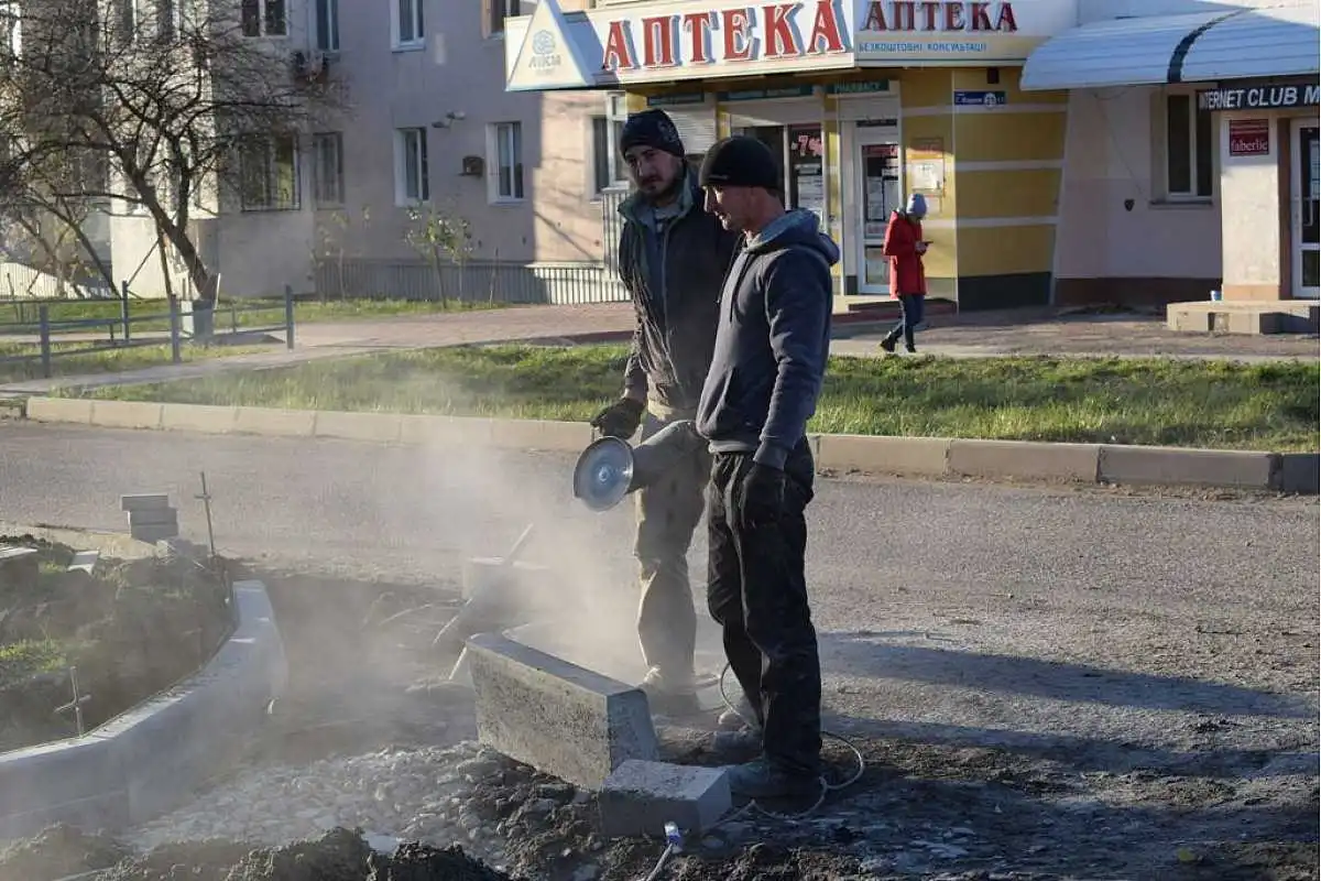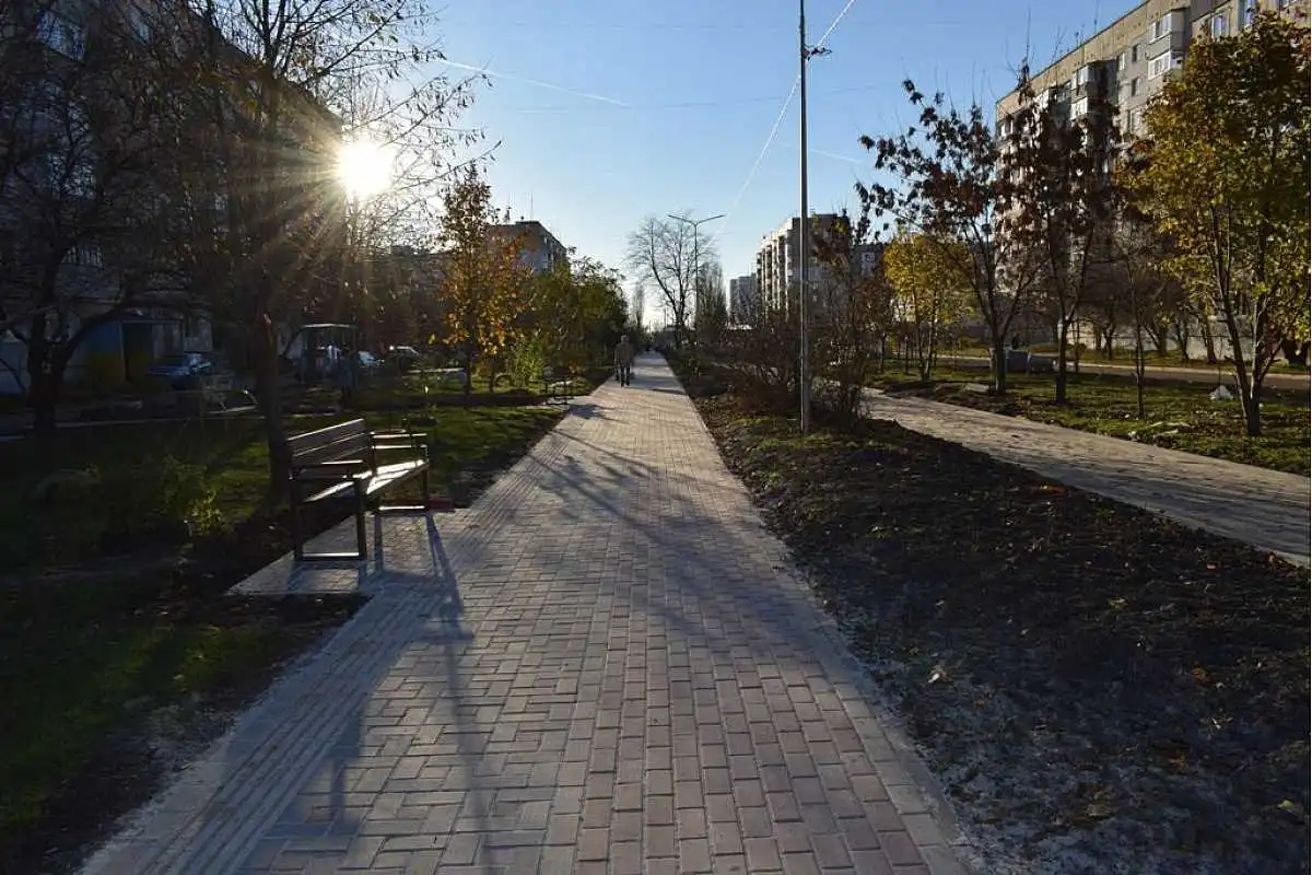 Тут вже змонтували зовнiшнє освiтлення. Наразi будiвельники укладають плитку на пiшохiдних дорiжках, облаштовують велодорiжки, встановлюють новi лавки. Вартiсть проєкту складає близько п’яти мiльйонiв гривень.