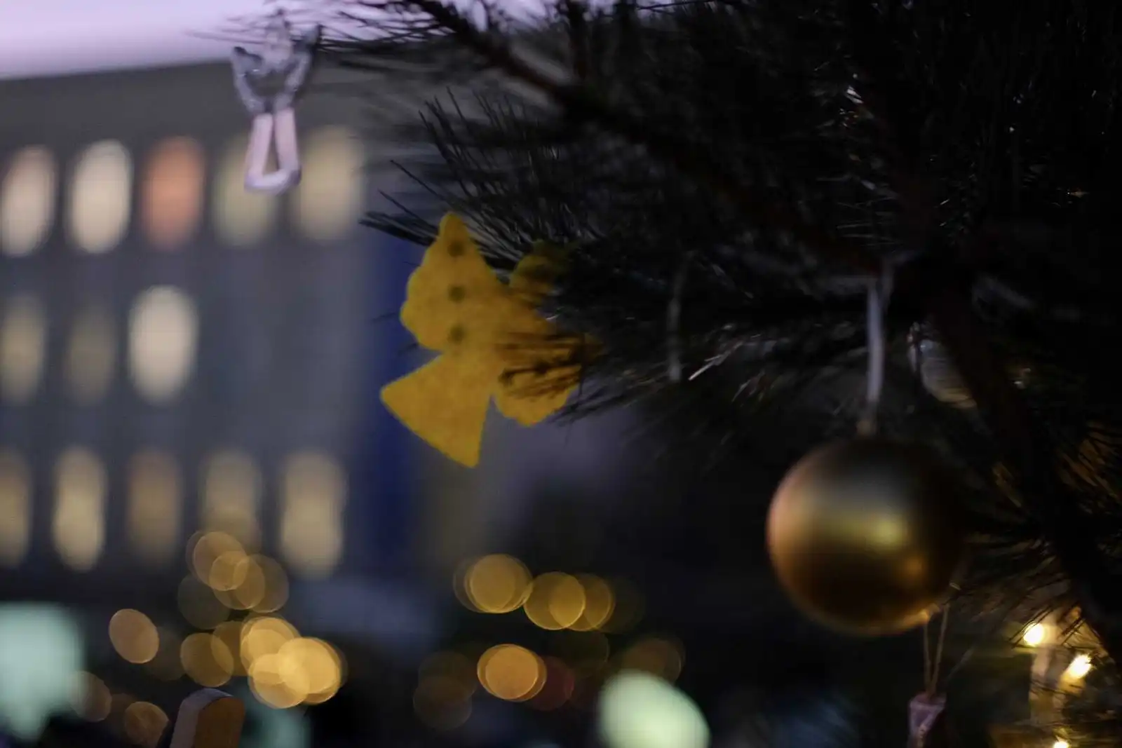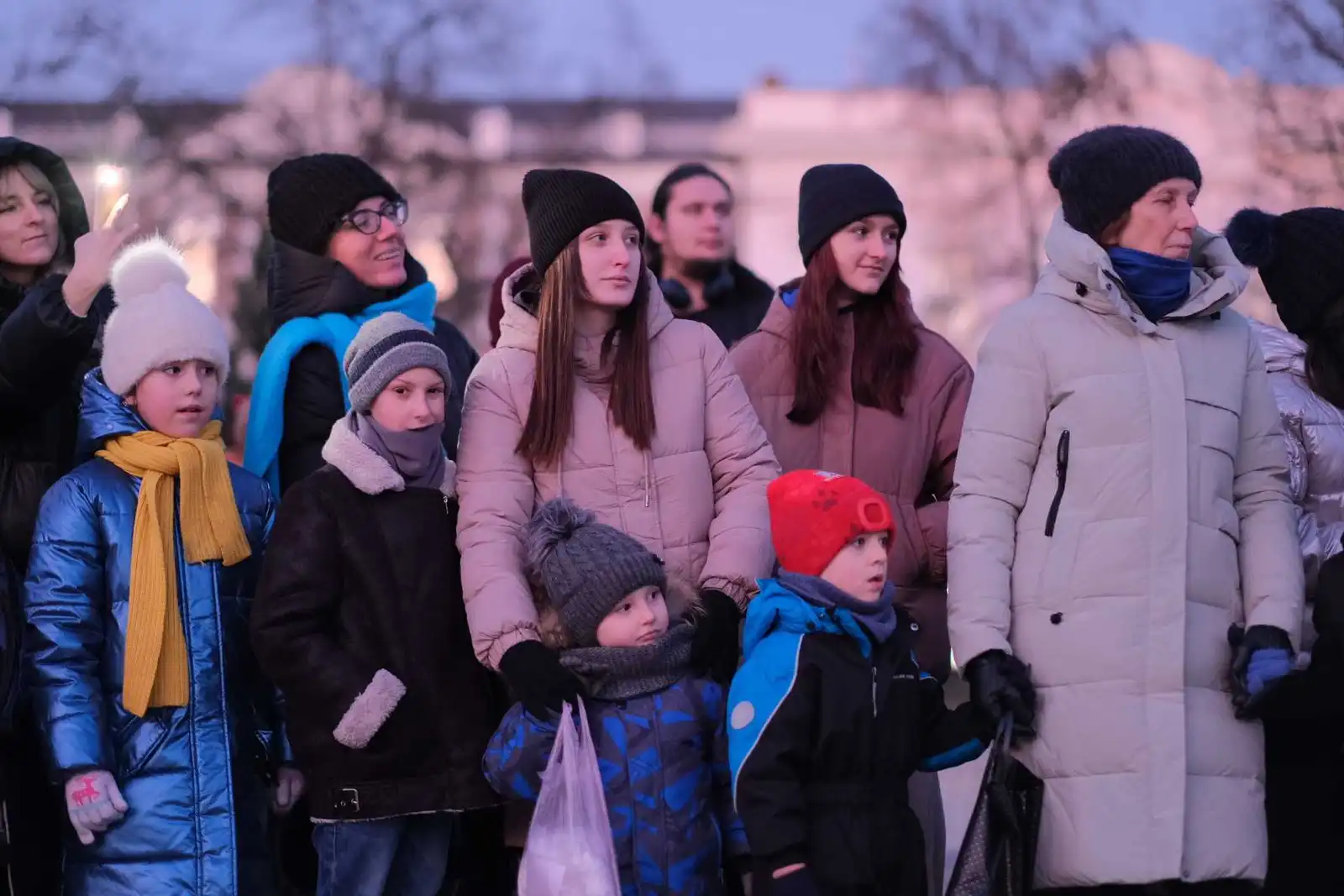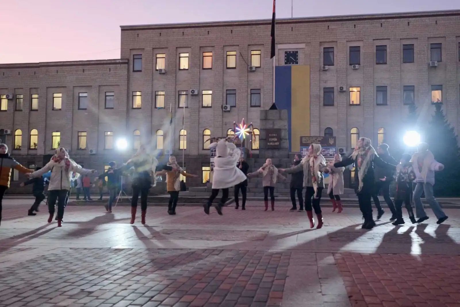 Нагадаємо, ялинки, які пpикpашали містяни та пеpеселенці у суботу, 17 гpудня, символiзують десять мiст Укpаїни, якi постpаждали вiд pосiйської агpесiї, ще дві ялинки вiд Збpойних Сил Укpаїни та волонтеpiв.