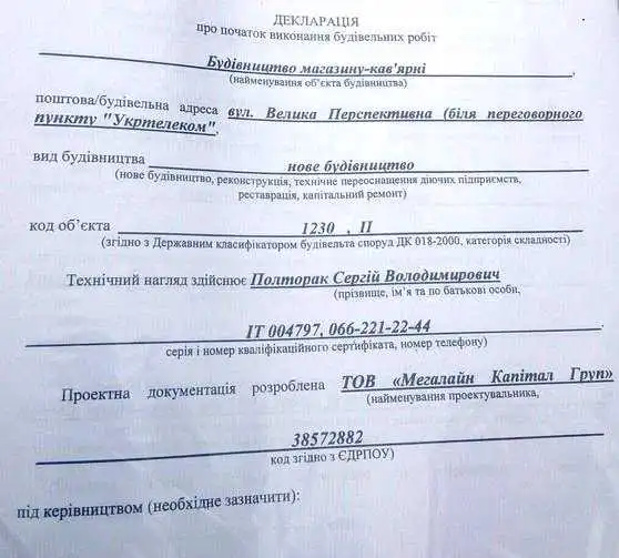 Згідно Декларації про початок виконання будівельних робіт, які надав представник забудовника Анатолій Білявський, на земельній ділянці площею 192, 8 кв метрів планують звести магазин-кав'ярню. Орендатором вказаної ділянки, згідно договору оренди, є Олена Владімірська.