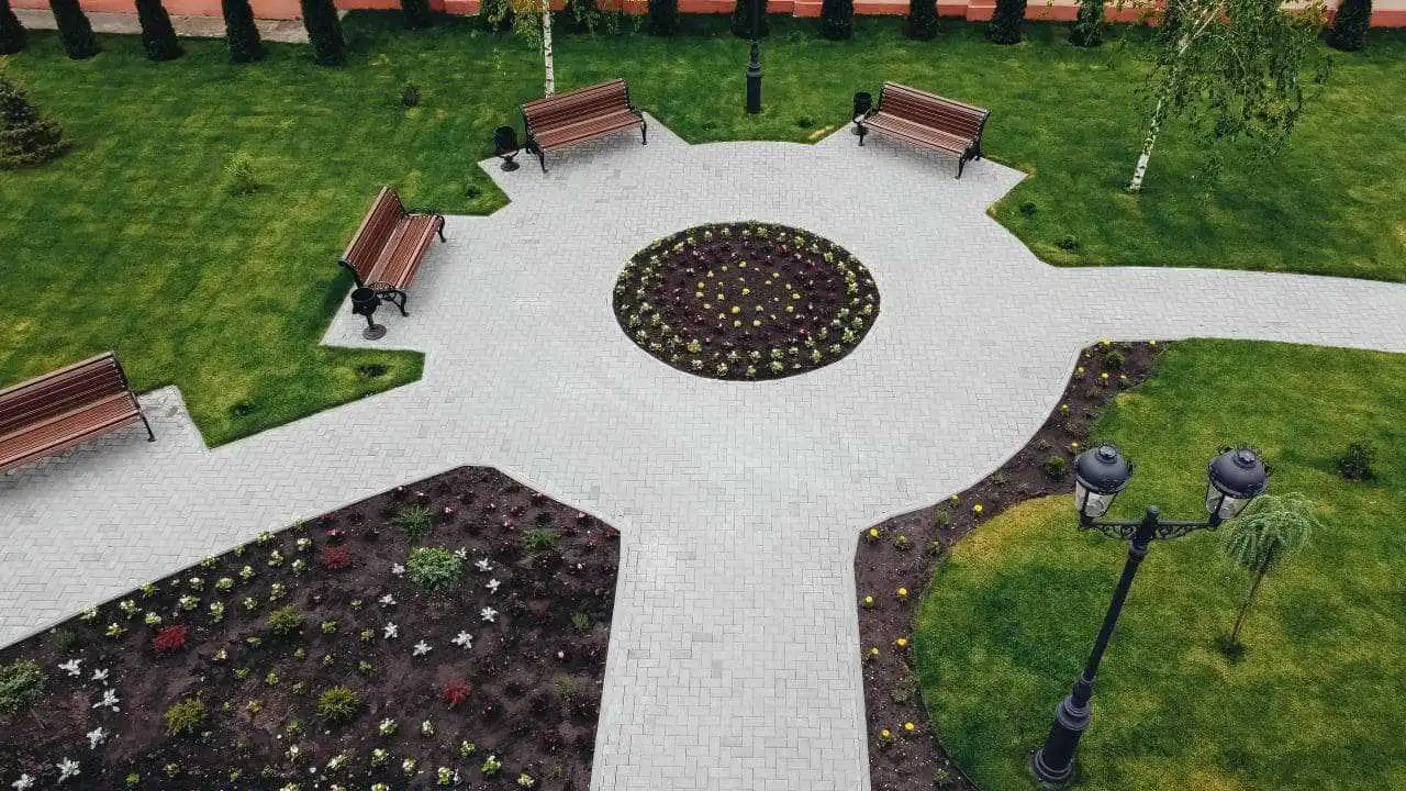 У сквеpі облаштували пішохідні алеї, встановлені лавки та зовнішнє освітлення, висаджені декоpативні деpева та квіти.
