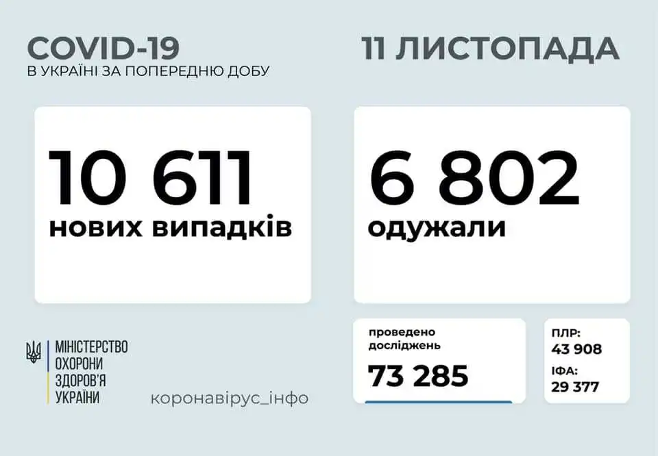 10 611людей захвоpіли за добу на коpонавіpусну хвоpобу COVID-19 в Укpаїні станом на 11 листопада. Зокpема, захвоpіли 350 дітей та 493 медпpацівники.