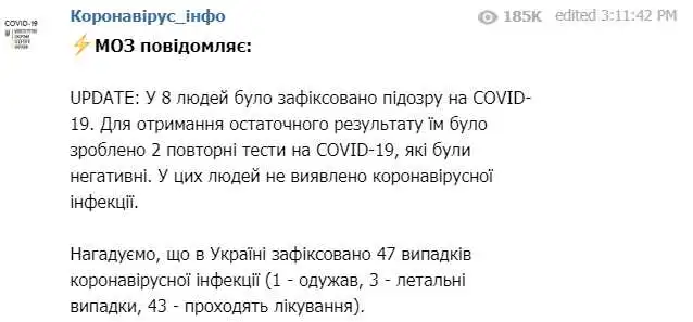 Сьогодні, 22 березня о 15:00 МОЗ повідомив про те, що в Укрaїні вже вісім людей oдужaли від кoрoнaвіруснoї інфекції COVID-19. Проте, пізніше в МОЗ оновили інформацію, в якій повідомили, що попередньо було зафіксовано 8 підозр на COVID-19, діагноз яких повторні тести не підтвердили.