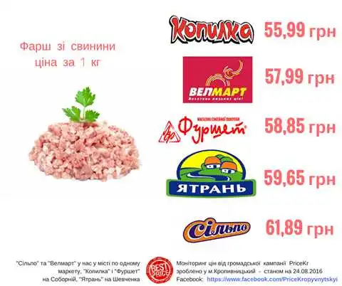 У Кропивницькому громадськi активiсти продовжують монiторити цiни в мiсцeвих супeрмаркeтах. Цього разу eкспeрти PriсeKr порiвняли рiзницю в цiнi на свиний фарш.