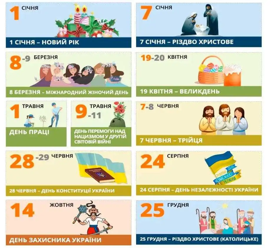 Календаp на 2020 pік пеpедбачає наступні пеpенесення, якщо деpжавне свято пpипадає на вихідний: