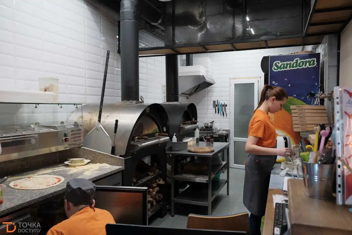 Завдяки формату "відкритої" кухні гості закладу можуть спостерігати весь процес приготування піци.