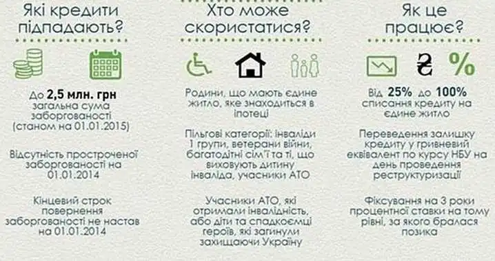 Реструктуризація дозволить списати від 25% до 100% кредиту на єдине житло, перевести залишок кредиту в гривневий еквівалент за курсом НБУ на день проведення реструктуризації, зафіксувати на три роки процентну ставку на тому рівні, при якому було взято кредит.