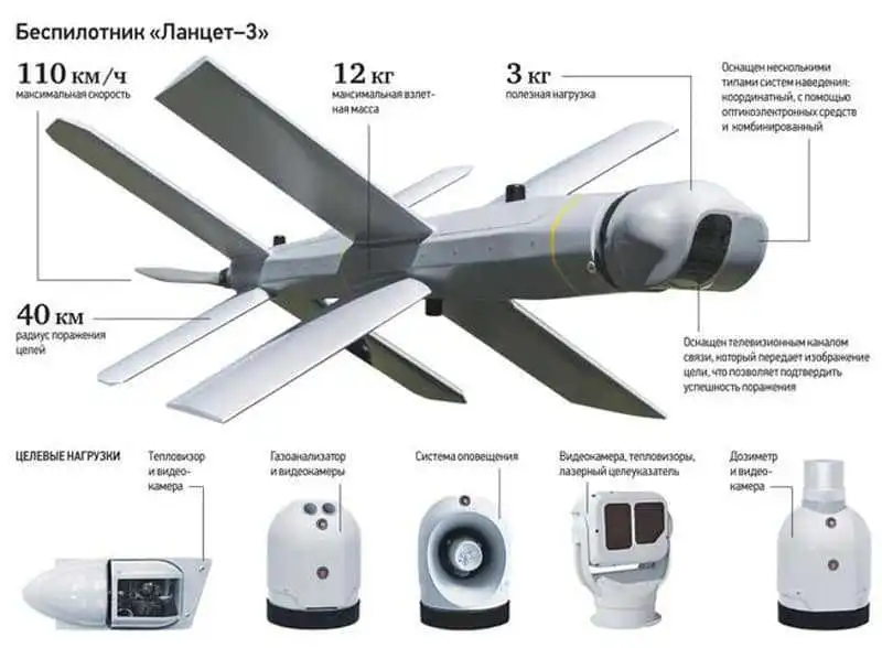 Довідково. Максимальна швидкість дрона-камікадзе останньої модифікації ("Ланцет-3") становить 110 км/год під час горизонтального польоту та 300 км/год під час атаки на ціль. Дальність дії – 40-50 км. Сам БПЛА важить близько 12 кг, з яких бойова частина (осколково-фугасна) – до 5 кг. Такий апарат може бути в повітрі майже годину.