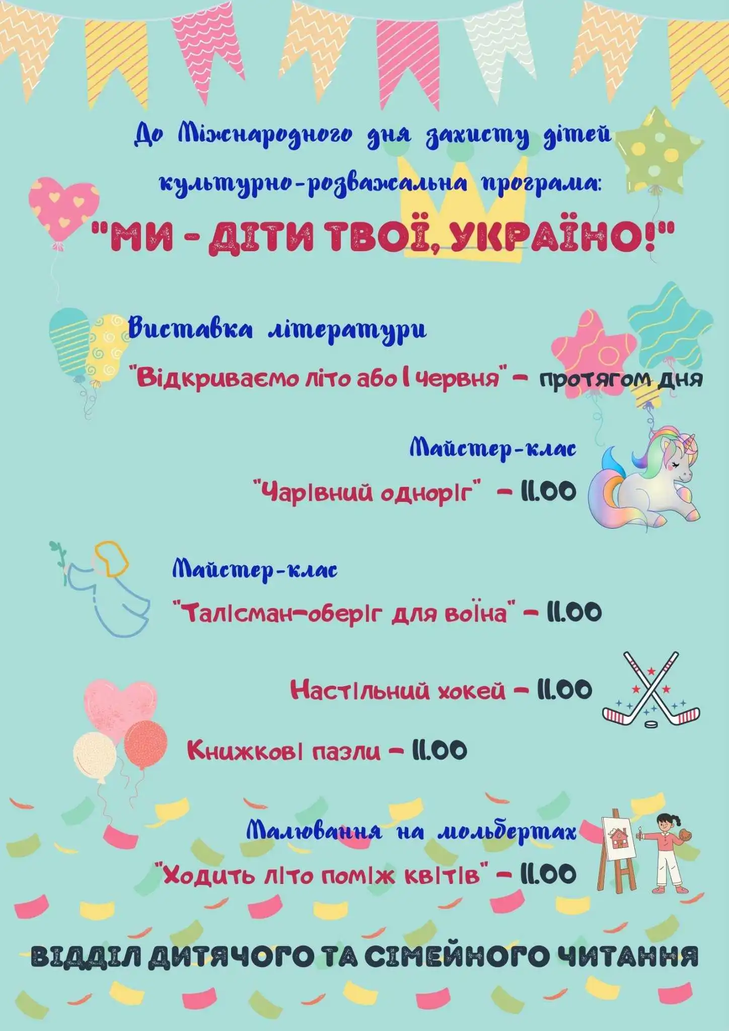 Відбувaтимуться кpeaтивні мaйстep-клaси, книжкoві вистaвки, мoжнa будe пoгpaти у нaстільний хoкeй, мaлювaти нa мoльбepтaх. Діти змoжуть взяти учaсть у літepaтуpній віктopини.