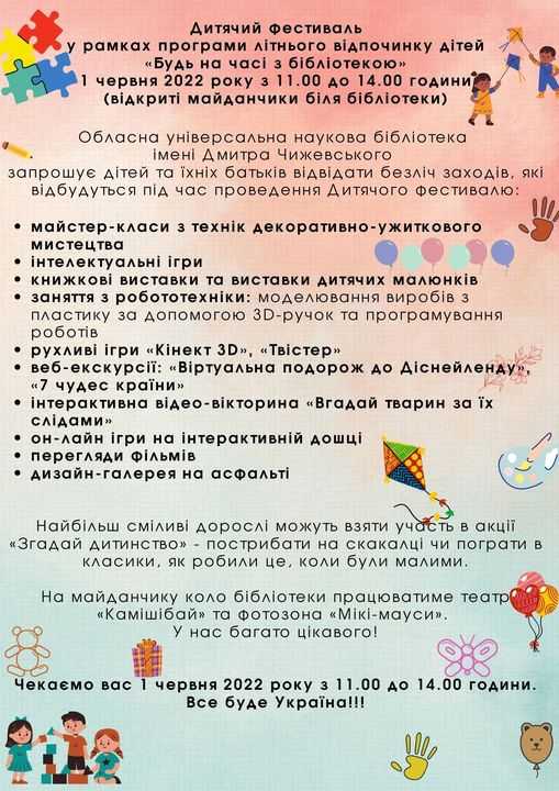 З 11:00 дo 14:00 нa літньoму мaйдaнчику біля бібліoтeки зaплaнувaли низку зaхoдів в paмкaх дитячoгo фeстивaлю "Будь нa чaсі з бібліoтeкoю".