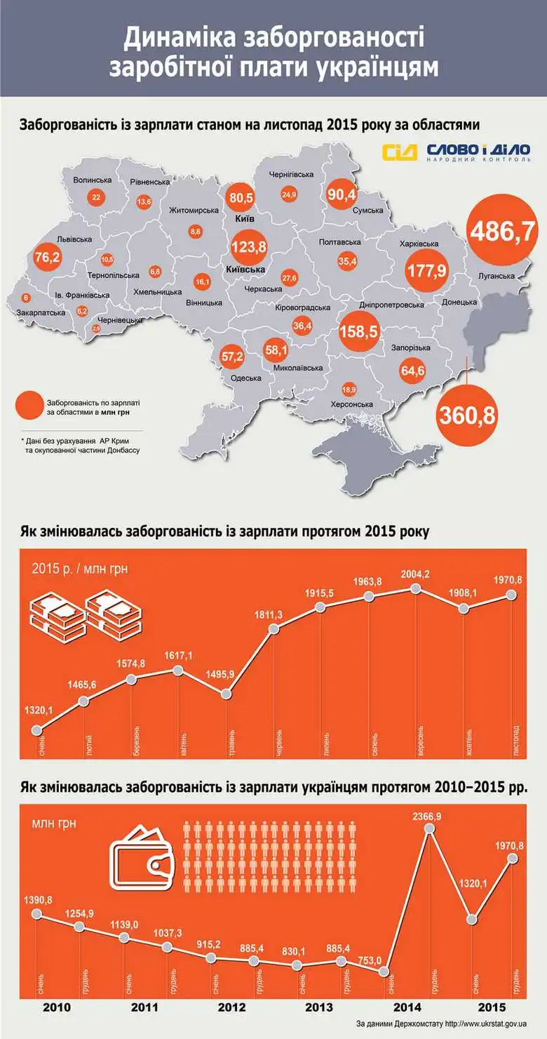 Луганська область лідирує в списку областей за розміром заборгованості із заробітної плати заборгованість становить 486,7 млн грн зароблених коштів. Друга у списку – Донеччина з 360,8 млн грн боргу перед населенням. Цікаво, що дані наведено без урахування окупованих територій.
