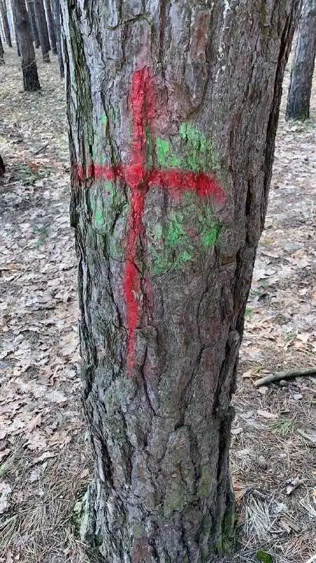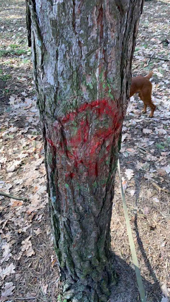 Мітку червоного кольору на фото виявили жителі Кропивницького у мікрорайоні Кущівка. Також сьогодні мітки ворогів виявили на деревах у цьому ж мікрорайоні.