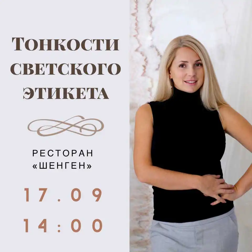 Наступного вівторка, 17 вересня, у Кропивницькому відбудеться тренінг «Тонкощі світського етикету». Тренеркою виступить оpганізатоpка надихаючих інтенсивів та благодійниця Наталія Кліменкова.